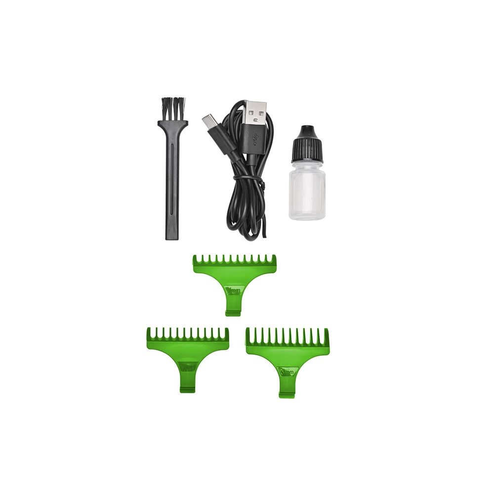 Incluye: Cortadora profesional, 3 peines guías transparentes (1mm/2mm/3mm), cuchilla móvil de cerámica, aceite lubricante, cepillo de limpieza, aceite lubricante, banda antideslizante y cable USB.